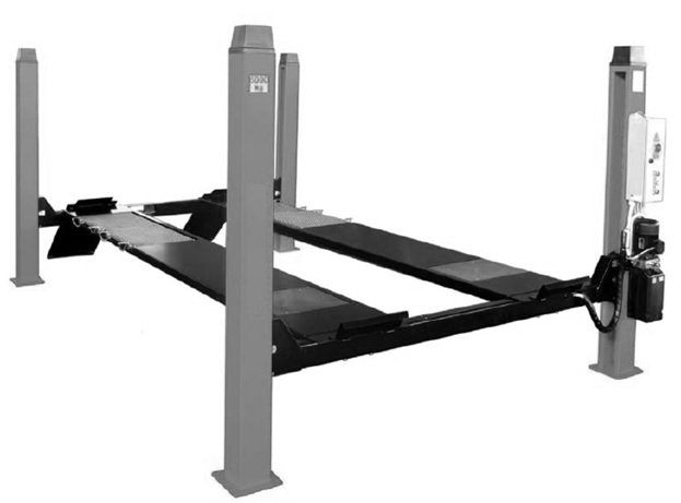 Электрогидравлический четырехстоечный подъемник для поста сход-развал, на 4 колеса. Цвет серый RAL 7040.
