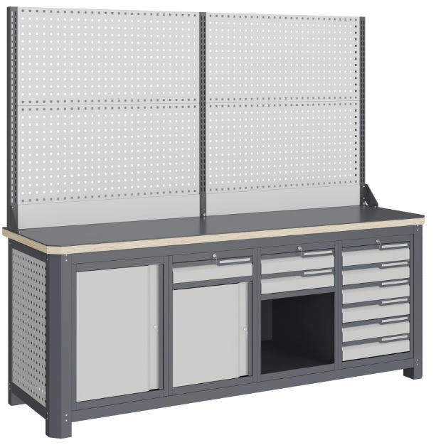 Cостоит из столешницы шириной 1993 мм, рамы верстака, состоящей из опор, перемычек, боковых перфопанелей, малых модулей S6, S7, S8 и S2 с комплектом полка-стенка SW2, двойного экрана с кронштейнами.