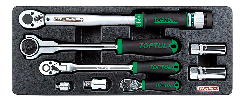 Набор трещоток 1/4", 3/8", 1/2", динамометрический ключ 3/8" 20-110 Нм, переходники и свечные головки, 8 предметов в ложементе (B) TOPTUL